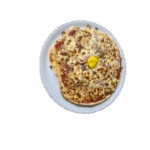 Base tomate, jambon, lardons, oignons, oeuf, mozzarella, épices